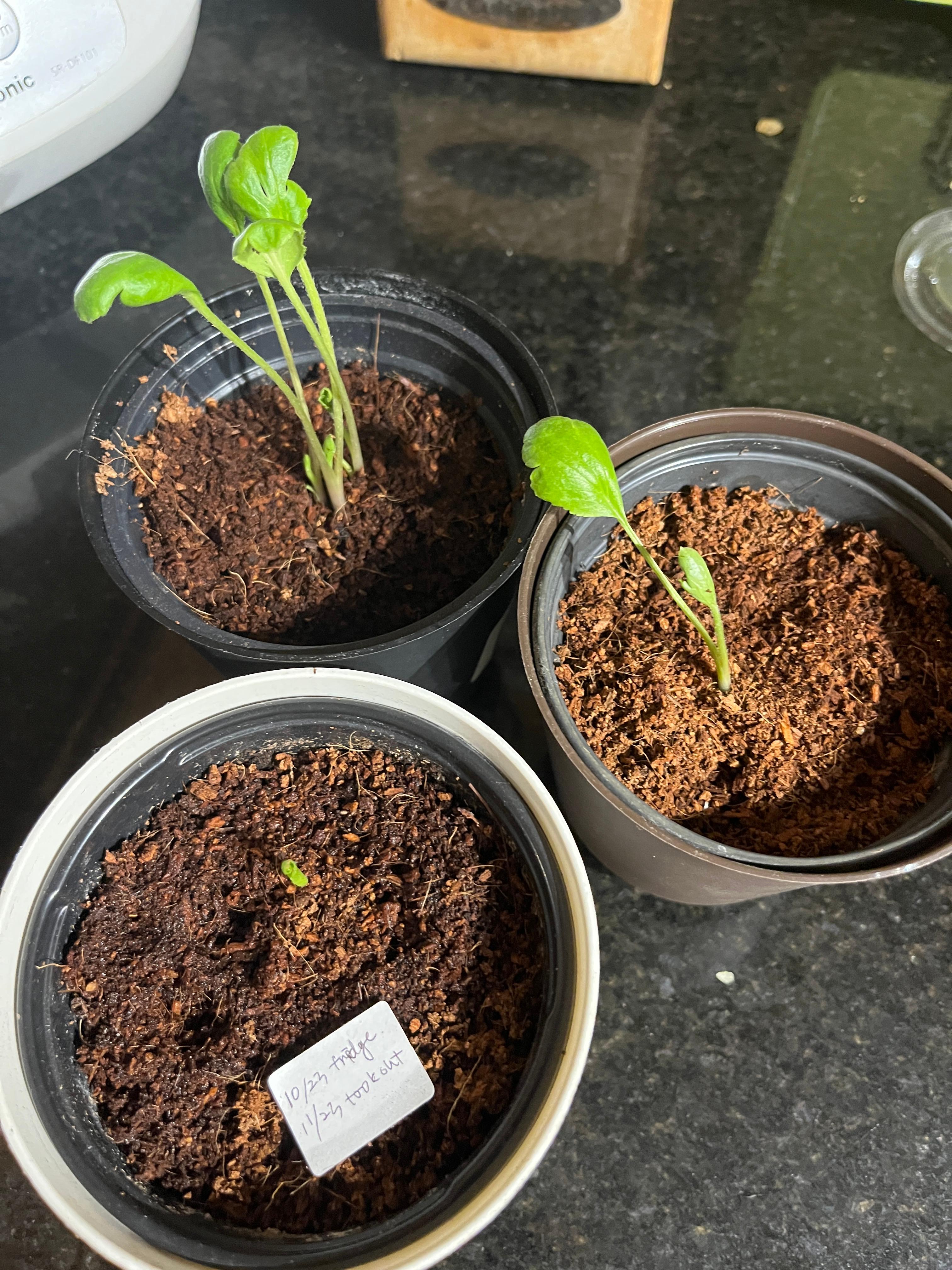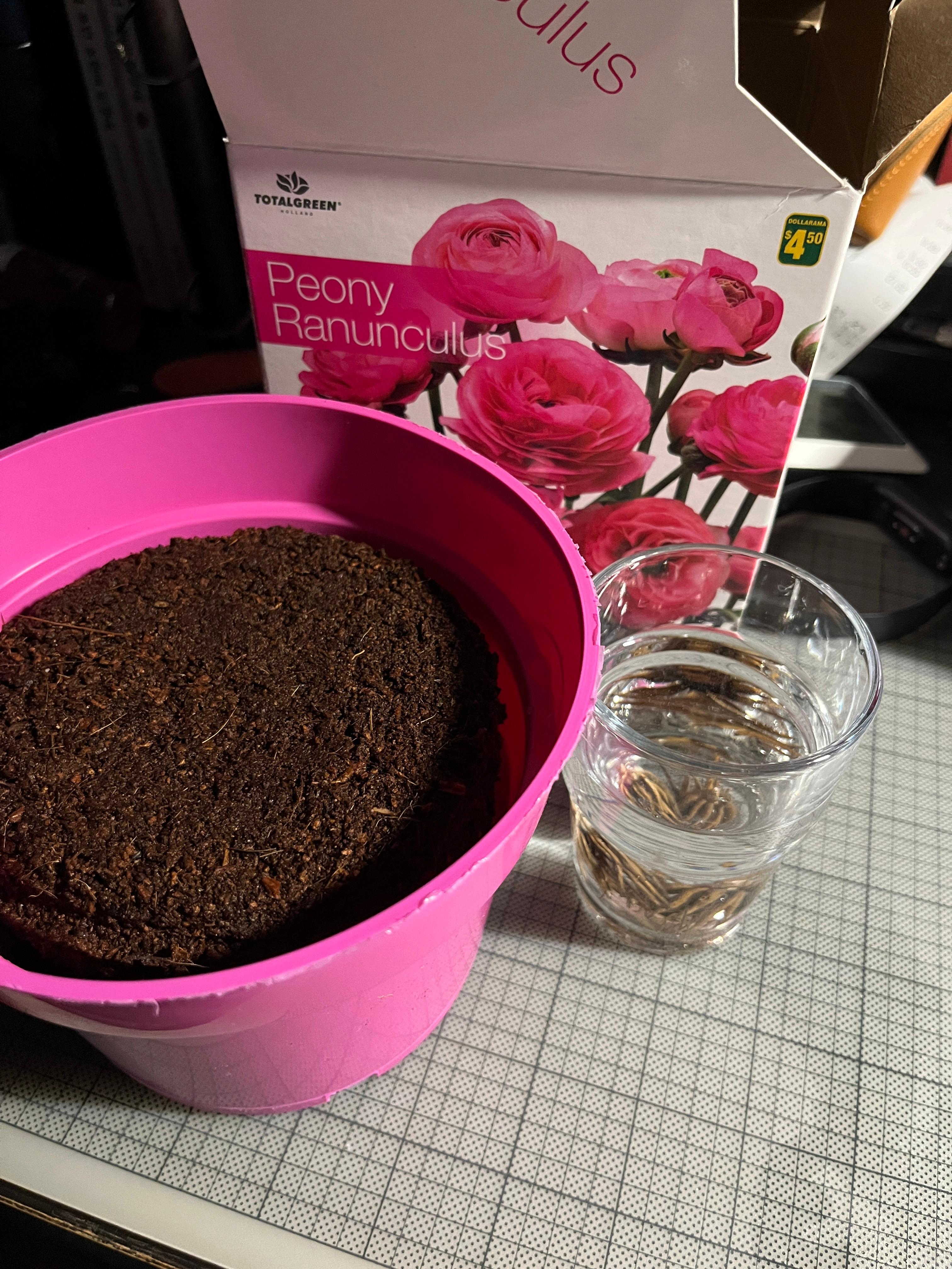 Only 3 roots inside, a compressed soil and a plastic flower pot. Followed the instruction, soak the roots and soil and 3 weeks of adapting the environment and suppose to go refrigeration period for a month. However, not even 2wk, the shoots came out and make some leaves. For safety, I divided 3 different pots and places. The speed was different but all came out.