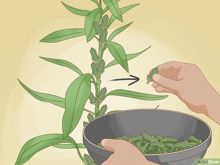 At the end of summer, pluck the fruit pods off your sesame plants.Collect the fruit pods in a basket, then spread them onto a flat surface to dry for 2-3 days. Once they’re dry, crack open the pods and scrape the seeds onto a flat surface. Leave the seeds to dry for another 2-3 days. Store your dry seeds in a sealed glass jar at room temperature.[11]