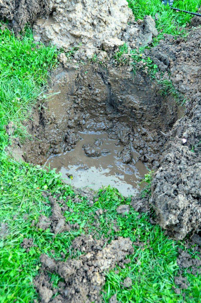 2.) Our soil is clay. Peach trees don’t like clay soil which is why we had to amend the soil. So we dug our hole extra deep and took out some of the existing topsoil to make room for our mixture of amended soil.